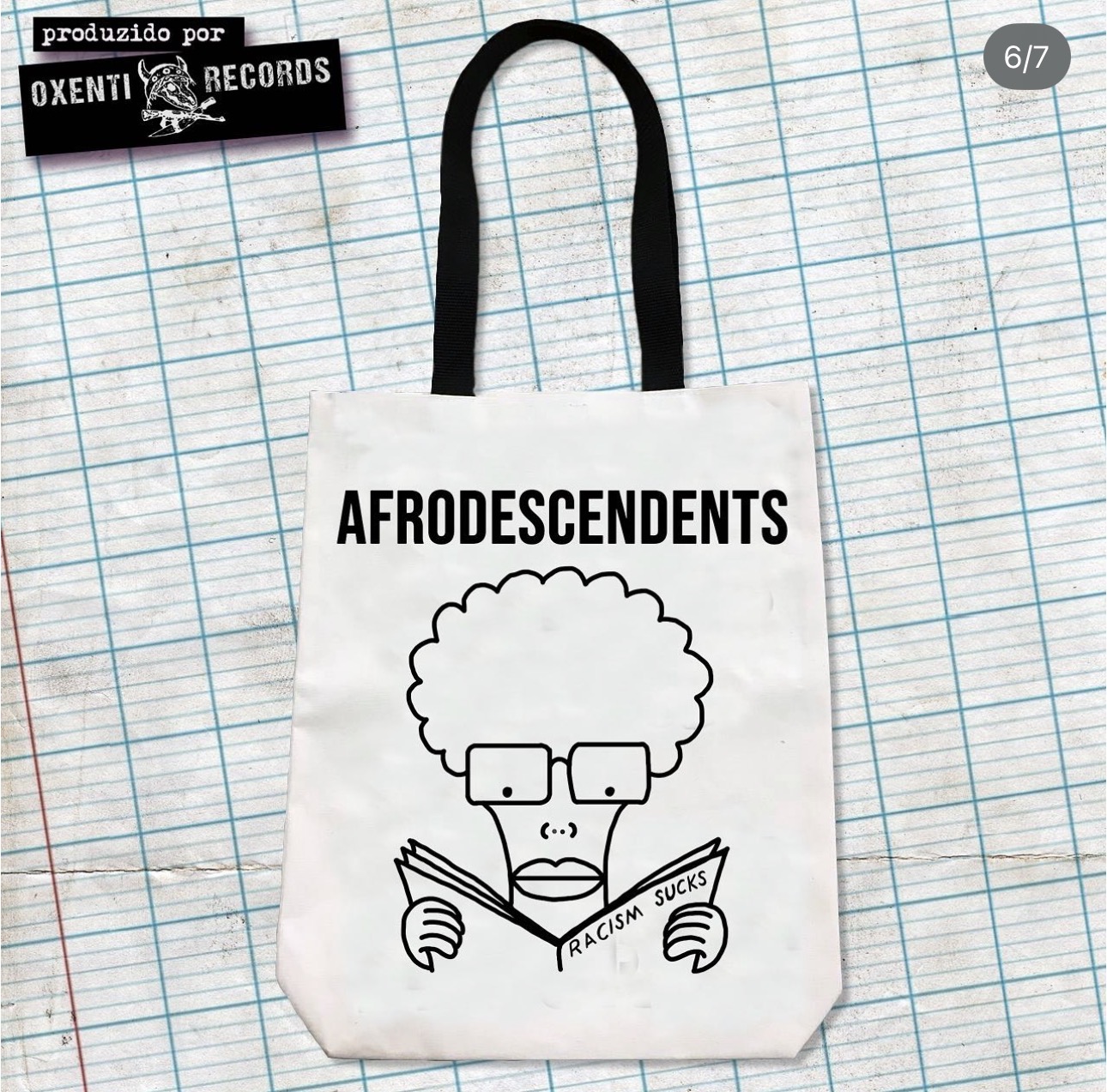 A Ecobag Afrodescendents traz um trocadilho com a icônica banda Descendents, transformando um símbolo clássico do punk/hardcore em uma nova leitura conectada à identidade e à cultura underground.